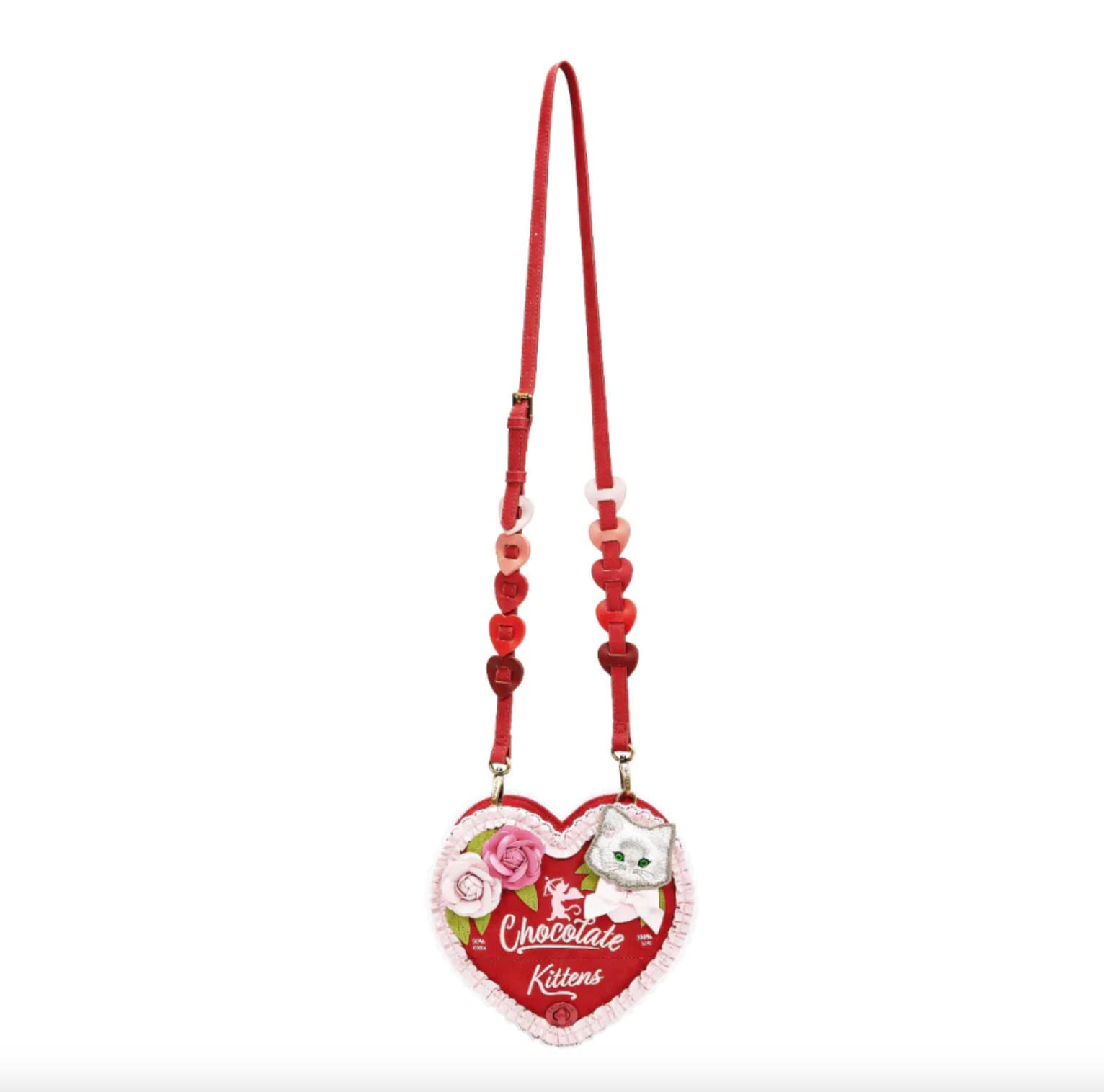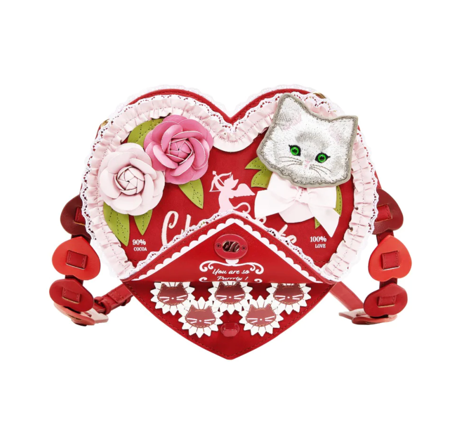 Need a gift for your sweetheart? The Heart Chocolate Box Bag will make hearts swoon! This heart shaped structured crossbody is constructed with vegan leather and lace trims to create a perfect home for your phone, wallet and other small essentials. The removable adjustable strap with heart detailing allows you to wear it your way. With decorative roses, ruffled detailing and the cutest embroidered kitten, this gorgeous bag is so purrrty! Take a look under the hidden flap - a sweet treat is revealed!